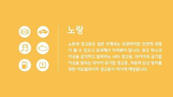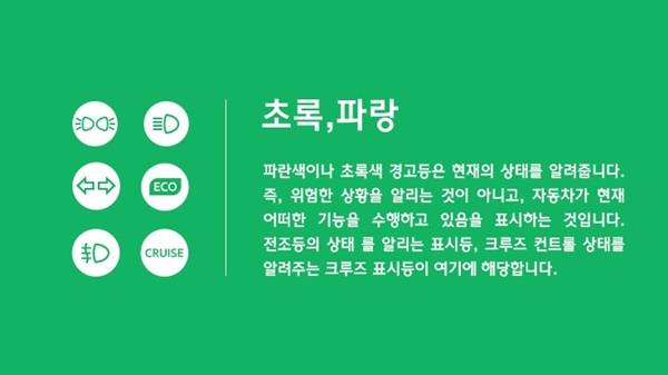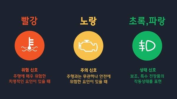 이외에도 엔진계기판의 각종 경고등 및 지시등은 일명 '신호등의 법칙'이 존재합니다. 즉 녹색과 황색, 적색등으로 구성된 신호등처럼 녹색지시등은 시스템이 정상 작동함을 의미합니다. 또한 황색계열 경고등은 당장 운행하는데는 지장이 없지만 점검 또는 주의를 요하는 의미로 사용됩니다.
