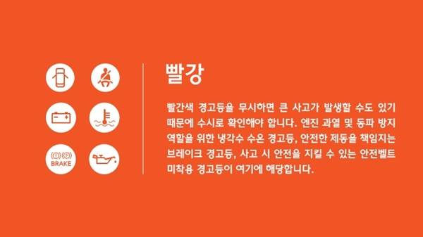 엔진경고등이나 TCS 경고등, TPMS 경고등, 연료경고등 등이 대표적이라 할 수 있습니다. 적색 경고등은 안전과 직결되거나 운행에 지장을 주는 시스템이 대부분으로 브레이크경고등, 냉각수온도, 배터리경고등, 에어백경고등, 문열림 경고등 등이 있습니다. <김아롱 기자=카테크>