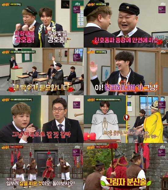 이어진 '아형성 전투' 콩트에서도 친호동파 '강라인'의 활약은 도드라졌다. 강호동을 보좌하는 부하 역으로 등장한 이특과 신동은 연신 "장군! 장군!"을 연호하며 분위기를 띄웠다. 특히 '백성들은 모두 굶주리고 있는데 너무 뚱뚱한 것 아니냐'는 이수근의 지적에 신동은 "일부러 찌운 것"이라며 "장군이 위기에 처했을 때 대신하기 위함이다"고 센스 있게 답했다.