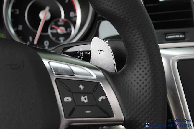 우선은 기어비 점검 순서. 100km/h에서의 엔진 회전은 1,750rpm 부근. 레드존은 6,300rpm부터. 7000rpm부터였던 SLK55AMG와 다르다. 이에 대해 AMG는 ML클래스의 특성상 저속역에서의 토크를 살리기 위함이라고 설명한다.