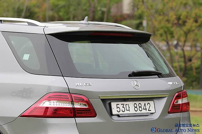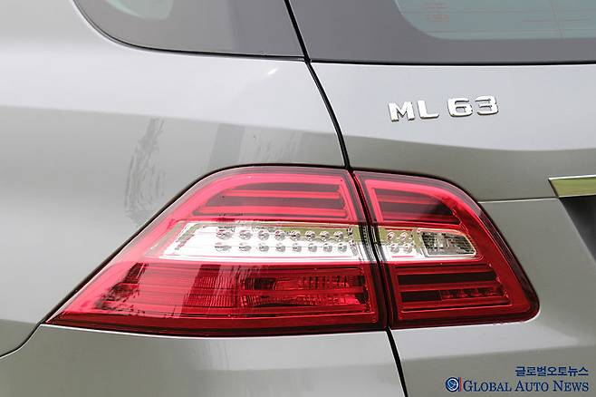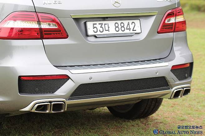 리어에서는 AMG 전용 리어 에이프런의 블랙 에어 아울렛과 매트 실버 크롬으로 마감된 트림 스트립이 베이스 모델과 차별화되어 있다. 가장 두드러진 것은 아무래도 2세트의 크롬 트윈 테일 파이프로 구성된 AMG 스포츠 머플러 시스템.
