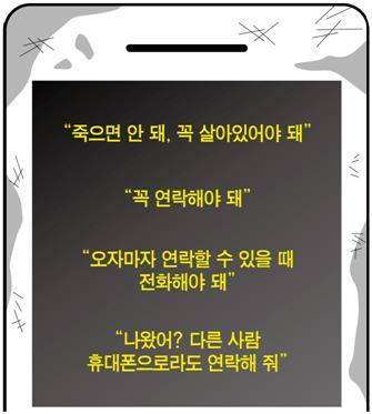 A씨가 읽지 못한 메시지엔 “꼭 연락해야 돼”, “오자마자 연락할 수 있을 때 전화해야 돼”, “해경이 경비정 투입했대” 등의 내용이 포함돼 있었다. 마지막 메시지는 “나왔어? 다른 사람 휴대폰으로라도 연락해 줘”라는 당부였다.