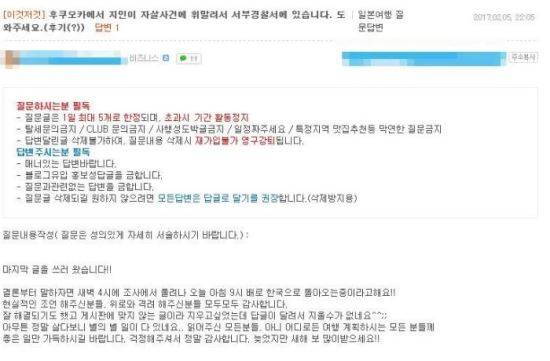 지난 5일, 일본 여행 정보를 교환하는 한 커뮤니티에 "후쿠오카에서 지인이 자살 사건에 휘말려 서부경찰에서 있습니다. 도와주세요"라는 제목의 글이 올라왔다.