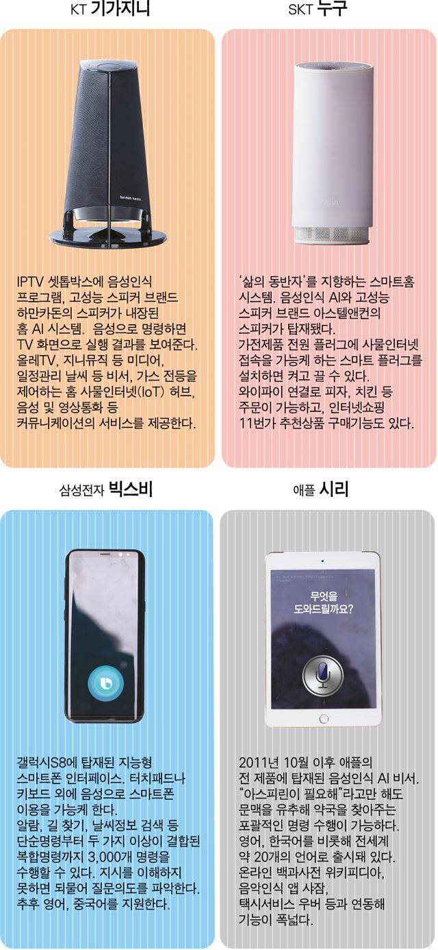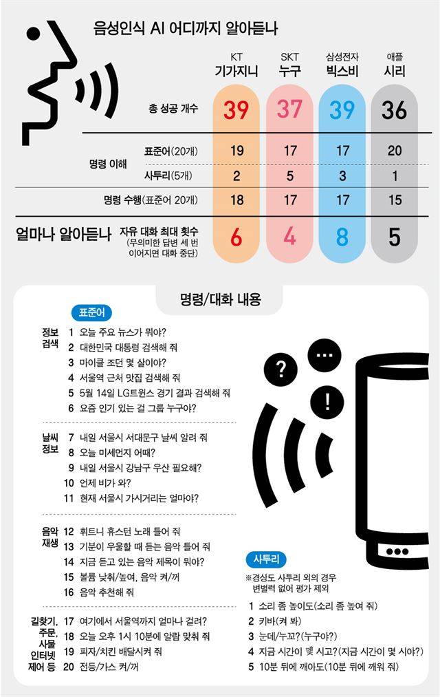 한국일보가 8~18일 한국어를 인식하는 AI인 KT 기가지니, SKT 누구, 삼성전자 빅스비, 애플 시리에 대해 사람 말을 얼마나 잘 알아듣는지 실험해 보았다. 20~60대 남녀 10명이 정보검색, 날씨, 음악재생, 길찾기, 주문 등 실생활에서 자주 할 만한 질문 20개(표 참조)를 물어서 이해와 수행에 성공한 개수를 각각 세었다. 단 명령 이해 평가에는 사투리 질문 5개를 포함시켰다. 각사 AI의 기능이 조금씩 다르지만 모두 자유대화까지 가능한 범용 음성인식 AI를 표방한다는 점을 고려한 것이다.