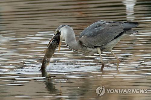 (강릉=연합뉴스) 유형재 기자 = 9일 강원 강릉시 남대천에서 왜가리가 죽어 썩어가는 물고기를 삼키려고 애를 쓰고 있다.