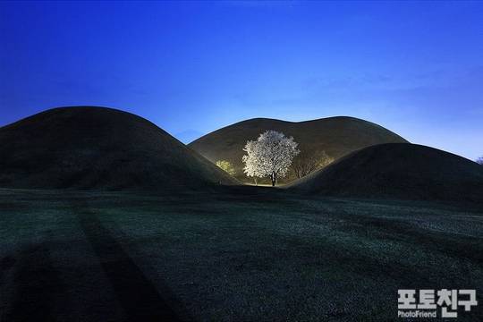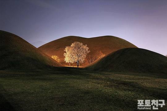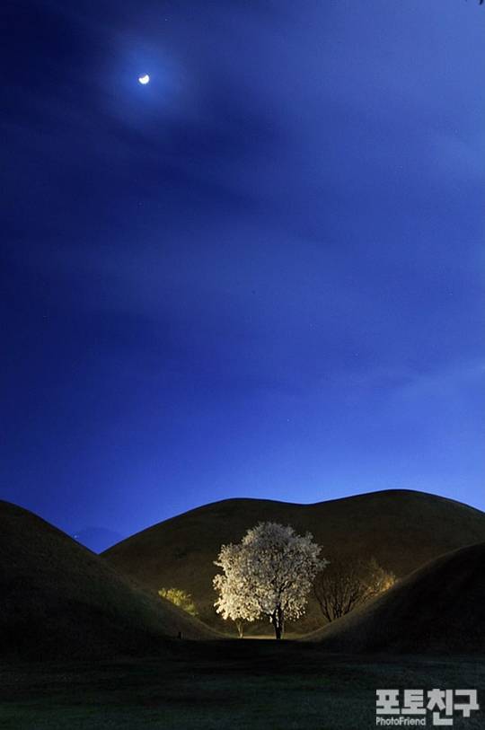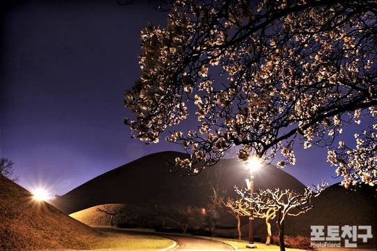 하얀 목련이 핀 대릉원의 봄 야경이 아름답습니다.