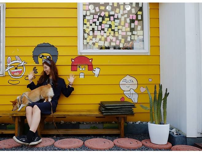 애견동반시에는 실내보다 더 넓고 예쁜 야외 테이블을 이용해야 해요. 야외는 더욱 이쁘게 꾸며져 있고 혹여나 날씨가 굳은 날에는 지붕이 있는 정자 같은 곳에 앉아도 되는데다 주인 부부도 강아지를 너무 예뻐해주셔서 마음 편히 식사할 수 있는 그런 곳이었어요. 바깥 외벽에는 사진을 찍고 갈 수 있는 귀여운 벽화도 있네요.