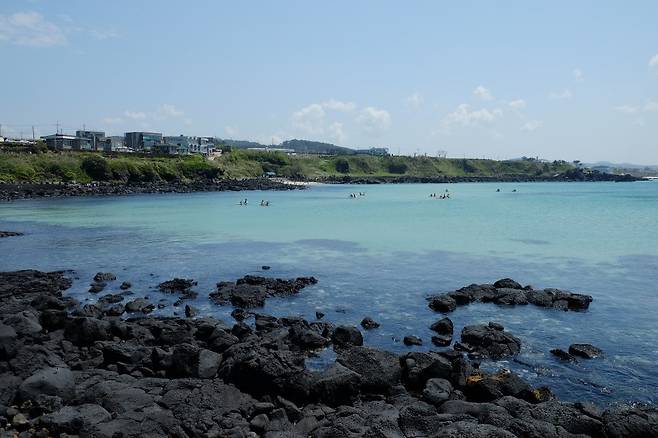 카페에 앉으면 보이는 바로 앞 김녕해변과 저 멀리 보이는 강아지 보리. 보리는 유기견이었는데 주인장님과 가족이 된 뒤 가게와 바다를 함께 지키고 있다고해요.