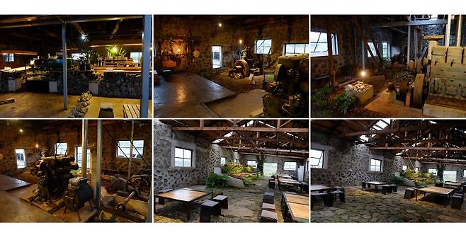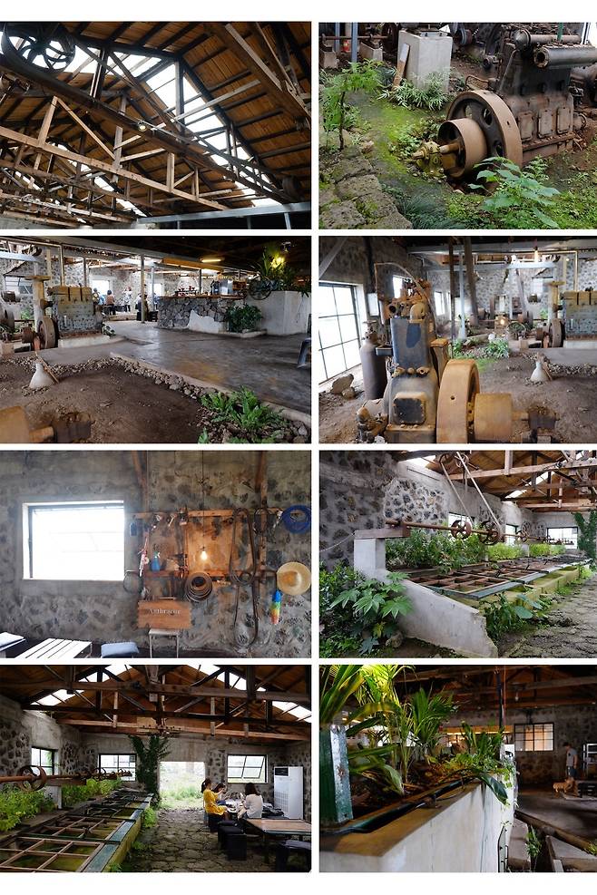 외관 모습이에요. 공장 자체가 갖고 있던 형태를 최대한 살려 기존에 있던 낡은 구조물들이 오히려 신비롭고 몽환스러운 느낌을 연출하게 도와주고 있어요. 거친 시멘트의 모습도, 옛 공장에 남아 있던 녹슨 낡은 기기들의 모습도, 제주에서만 볼 수 있는 다양한 신비스러운 나무와 식물들도 함께 뒤섞여 마치 신비의 숲에 와 차를 마시는 느낌이랄까요.