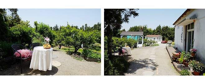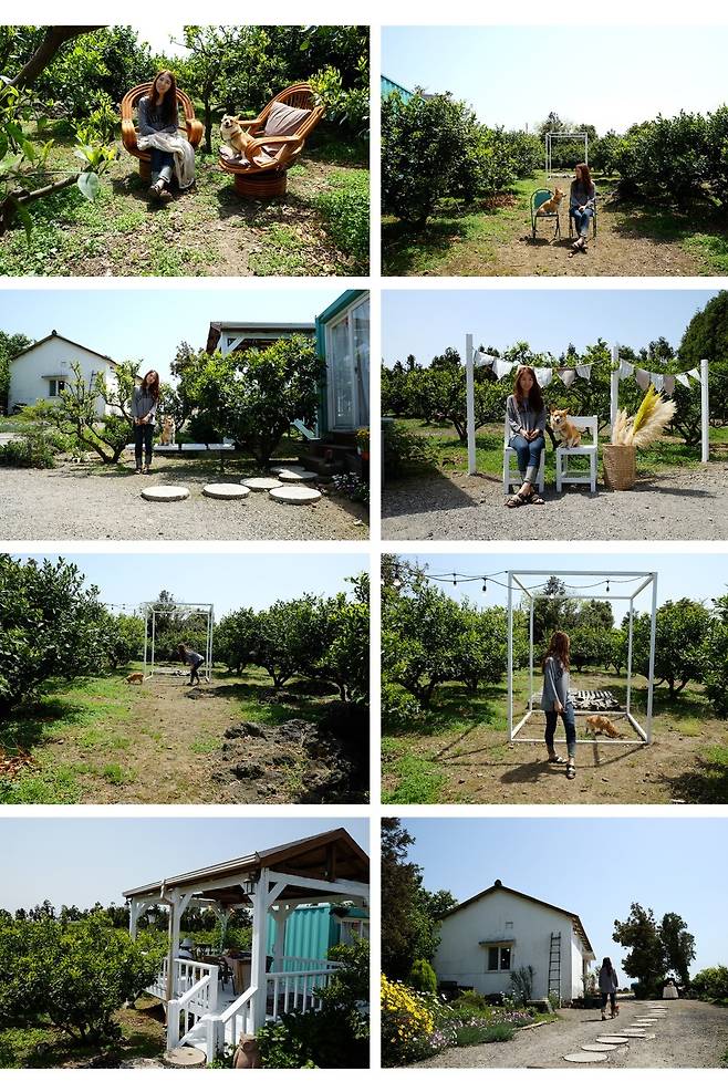귤꽃 카페에 또 하나의 특색은 바로 카페 앞 마당에 자리잡은 귤밭이에요. 제주도민들에게는 흔할지 몰라도 여행자들에겐 귤밭이 생소하고 예쁘고 신비롭잖아요. 제주를 여행하다 보면 길에 흔히 보이긴 하지만 그렇다고 또 함부러 들어갈 수도 없는 그런 귤밭을 개방해 둘러볼 수 있고, 곳곳에 촬영 포인트로 소품들도 있어 재미있고 멋진 구경거리를 선물해주고 있어요.