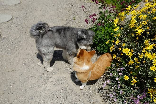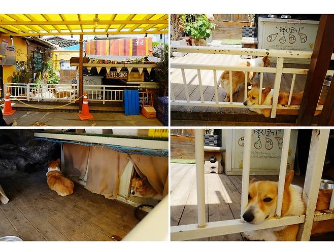 세 공간 사잇길이 바로 포토존이자 봄날 카페의 구경거리죠. 카페 초입에 있는 마스코트 웰시코기 봄, 여름, 가을, 겨울이가 살고있어요.