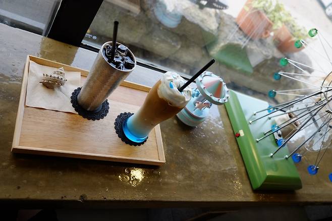 파랑파랑한 음료가 대표 메뉴인 구름라떼인데요. 특별히 무슨 맛이라기 보다는 농띠 카페 앞에 펼쳐진 김녕해변을 보며 사랑하는 이와 함께 마시기에 좋을 만큼 달달하고 부드러운 느낌이라고 할까요.
