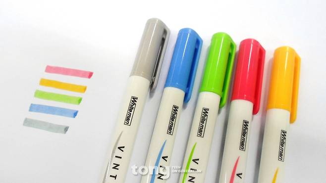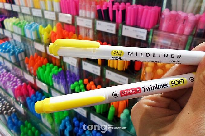 형광펜 역시 예외는 아니다. 형광펜도 일본 제품이나 한국 제품이냐에 따라 가격에 큰 차이가 난다. 하지만 형광펜이야말로 비싼 펜과 저렴한 펜의 차이가 크지 않은 편이다. 국산 형광펜 제품 중 저렴하면서도 좋은 제품들이 많지만 그 중에서도 ‘동아 트윈라이너 소프트’를 추천한다. 이 제품은 ‘제브라 마일드 라이너’ 라는 일본 제품과 매우 흡사하다. 디자인부터 매우 비슷하게 생겼지만, 가장 중요한건 색상의 차이가 거의 없다는 점이다. 두 제품의 색상을 비교해보았을 때, 구분하기 힘들 정도다. 색상도 ‘제브라 마일드 라이너’ 제품과 마찬가지로 매우 다양하다. 진정한 가성비 갑을 원한다면 다이소로 가자