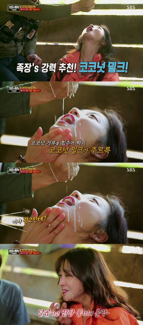 이에 이를 폭풍 흡입하던 김병만은 조보아에게 "먹어볼래?"라며 코코넛 가루를 짠 코코넛 밀크를 그의 입에 넣어줬다.