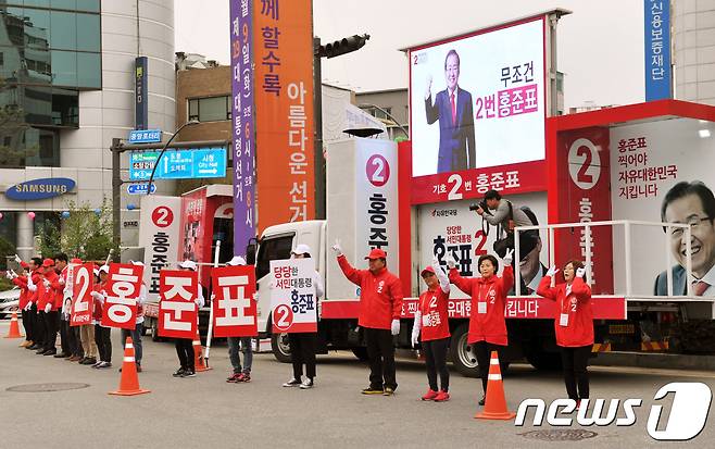 (춘천=뉴스1) 박하림 기자 = 제19대 대통령선거 공식 선거운동이 시작된 17일 자유한국당 강원도당 시·도의원을 비롯한 선거운동원들이 강원도 춘천시 중앙로터리 앞에서 홍준표 후보의 지지를 호소하고 있다. 2017.4.17/뉴스1