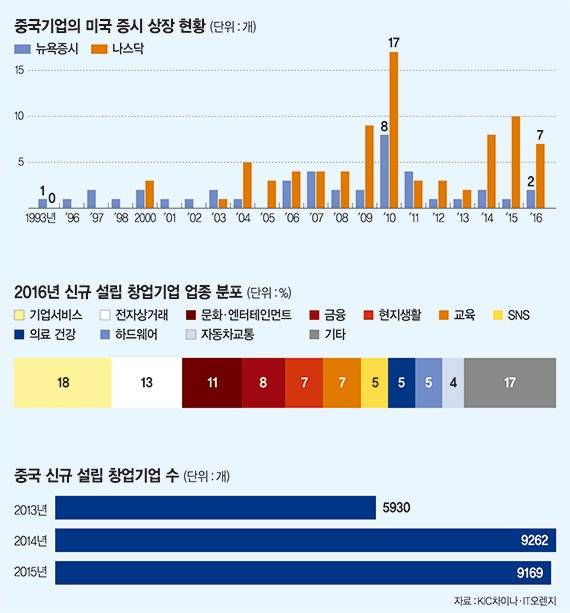 【 베이징.상하이.선전=조창원 특파원】 베이징의 중관춘 창업거리에 위치한 창업카페 '3W' 건물 1층에 들어서자 벽면에 두 눈을 사로잡는 그래프가 있었다. 뉴욕 증시에 상장된 중국 기업 명단이 연도별로 표기돼 있었다. 마치 명예의 전당 같은 분위기다. 그리고 올해 연도 부분을 빈 공간으로 남겨두고 '다음은 누구 차례인가'라는 글로 여운을 남긴다. 20대 젊은이들이 창업센터 테이블에 한 자리씩 앉아 노트북으로 사업계획서를 작성하는 모습이 공무원시험과 기업 취업준비를 위해 독서실에서 씨름하는 한국의 취업 풍경과 대조를 이뤘다.