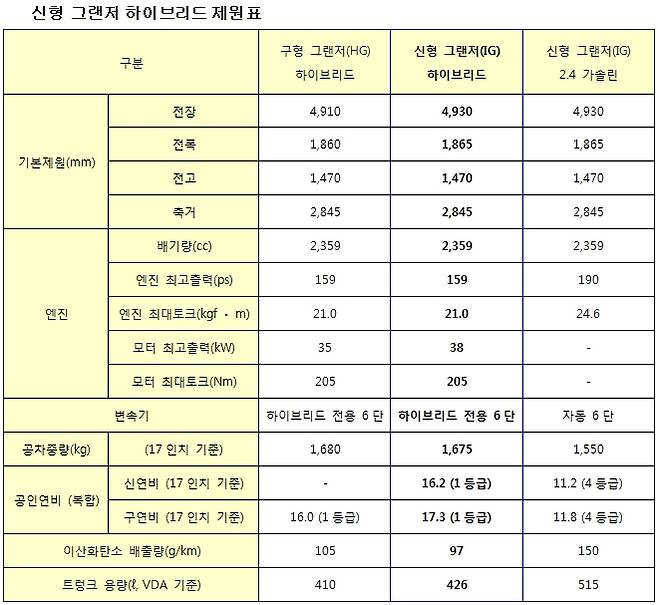 신형 그랜저 하이브리드의 파워트레인은 최고출력 159마력, 최대토크 21.0kgfㆍm의 넉넉한 출력을 발휘하는 세타II 2.4 MPI 하이브리드 전용 엔진과 기존 모델 대비 8.6% 출력이 개선돼 최고출력 38kW, 최대토크 205Nm을 발휘하는 고출력 모터 하이브리드 전용 6단 자동변속기가 조합됐다.