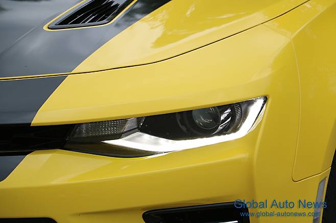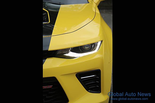 앞 얼굴에서는 범퍼를 중심으로 에어 인테이크가 더 커진 대신 그릴은 가늘어졌다. 좌우 헤드램프에는 LED 주간 주행등이 추가됐다. 카마로의 트레이드 마크인 Halo Ring(헤일로링)으로 불리는 커다란 헤드램프는 그대로다. 적지 않은 변화인데도 그렇다고 카마로라고 하는 이미지를 상쇄시키거나 하지는 않는다. 그로테스크한 이미지로 남성미를 물씬 풍긴다. 범퍼의 돌출 정도가 줄었고 보닛 선단의 V자형 벤트는 없어졌다.