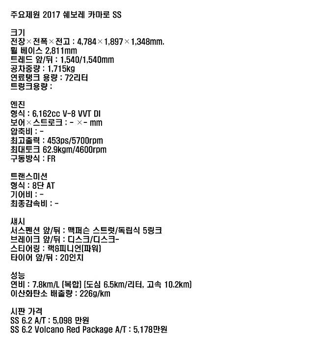 기본기에 더 충실하고 질감을 높이는 노력에 대해 합리적인 가격도 세일즈 포인트로 내 세우고 있다. 쉐보레 카마로 SS의 한국시장 시판 가격은 5,098만원, 볼케이노 레드 패키지는 5,178 만원이다. 포드 머스탱보다 싸다. 미국시장에서 머스탱을 잡은 카마로 한국시장에서도 뒤진 인지도를 극복하기 위한 전략적 가격이다.