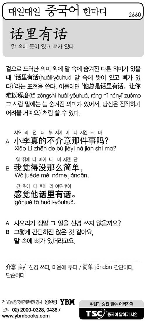 [매일매일 중국어 한마디] 말 속에 뜻이 있고 뼈가 있다