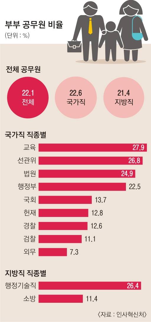 [서울신문]공무원과 결혼한 공무원, 즉 공무원 부부가 5명 중 한 명꼴(22.1%)로 많아졌다. 특히 교사의 경우 부부 공무원 비율이 27.9%로, 30%를 육박하는 수준이다. 세간에선 안정된 신분과 웬만한 중소기업 근로자를 웃도는 소득, 탄탄한 후생복지 등을 들어 ‘부부 공무원’을 ‘공무원보다 좋은 유일한 직업’이라고 일컫는다.
