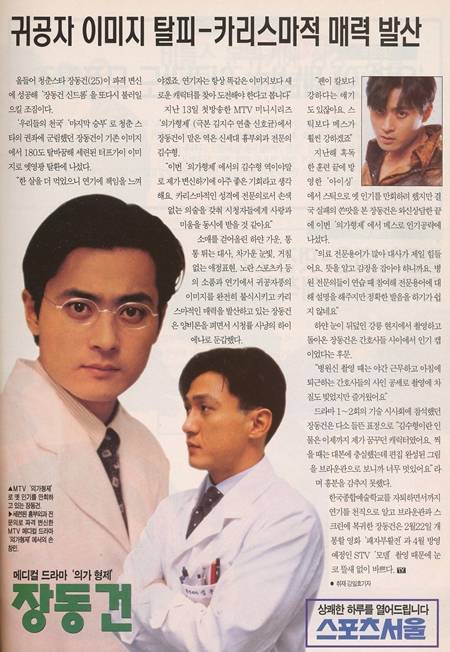 [ 올 들어 청춘스타 장동건(25)이 파격 변신에 성공해 '장동건 신드롬'을 또다시 불러일으킬 조짐이다. '우리들의 천국', '마지막 승부'로 청춘스타 권좌에 군림했던 장동건이 기존 이미지에서 180도 탈바꿈해 세련된 터프가이 이미지로 옛 영광 탈환에 나섰다. 지난 13일 첫 방송한 MTV 미니시리즈 '의가형제'에서 장동건이 맡은 역은 신세대 흉부외과 전문의 김수형. 소매를 걷어올린 하얀 가운, 통통 튀는 대사, 차가운 눈빛, 거침없는 애정표현, 노란 스포츠카 등의 소품과 연기에서 귀공자풍의 이미지를 완전히 불식시키고 카리스마적인 매력을 발산하고 있는 장동건은 양비론을 펴면서 시청률 사냥의 하이에나로 둔갑했다.