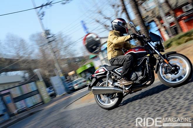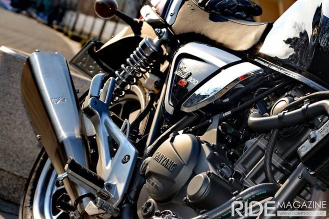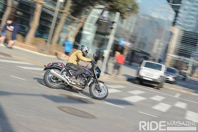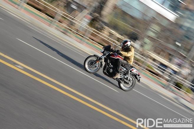 실제 접해본 울프300은 카페 레이서 버전입니다. 카페레이서라고 해서 꼭 카페와 카페사이를 질주해야만 하는 건 아닙니다. 라이딩 포지션을 살펴볼까요? 핸들은 살짝 멀리 있으며 폭은 넓지 않습니다. 덕분에 상체는 슬쩍 숙여지고 가속감에 대응하기가 수월해집니다. 그에 반해 하체 포지션은 꽤 루즈합니다. 포워드 스텝은 아니지만 느긋함이 묻어나는 네이키드 바이크 포지션 정도로 편안합니다.