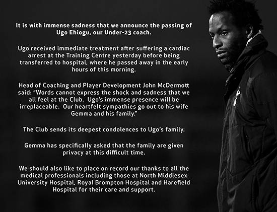 훈련장에서 급작스레 쓰러졌던 우고 에히오구(44) 토트넘 홋스퍼 U23 코치가 병원으로 이송했지만 결국 숨을 거둔 것으로 알려졌다.