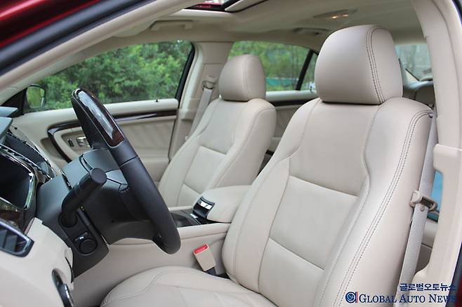 시트는 5인승. 운전석 조수석 공히 8웨이 전동조절식으로 간단한 마사지 기능이 추가되어 있다. 6개 방향으로 눌러 주는데 럼버 서포트 감각이다. 안락성을 더 중시한 세팅이다. 시트 히팅과 냉방 기능은 각각 3단계로 조절이 가능하다. 액티브 모션(Active MotionTM)으로 구성된 멀티 컨투어 시트는 포드의 자랑이다. 허리와 허벅지 부분에 있는 7개의 공기 쿠션으로 시트의 곡면을 자유롭게 조절하면서 마사지할 수 있다. 이론상으로는 그렇지만 혈액순환까지 가능할지는 궁금하다.
