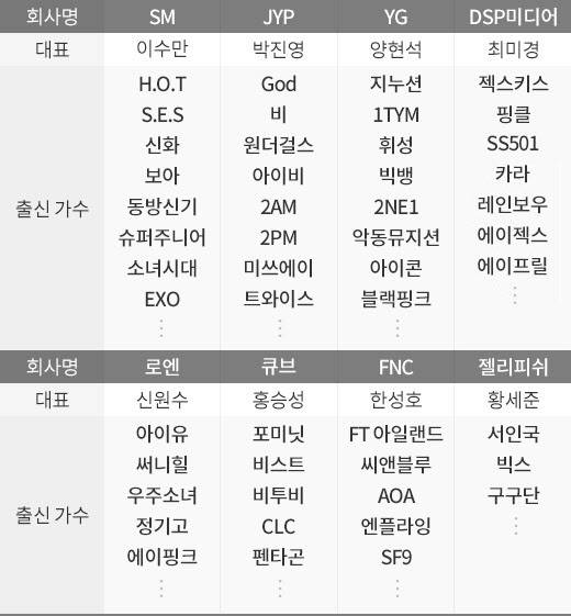 이번 조사 대상 연예 기획사는 자산총액이 120억원 이상인 에스엠엔터테인먼트(SM), 로엔엔터테인먼트, 제이와이피(JYP), 에프엔씨엔터테인먼트(FNC), 와이지엔터테인먼트(YG), 큐브엔터테인먼트, 젤리피쉬엔터테인먼트, 디에스피미디어(DSP) 등 8개 업체였다.