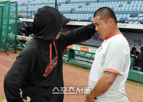삭발한 한화의 양성우가 롯데의 한선배로부터 이야기를 듣고 있다.