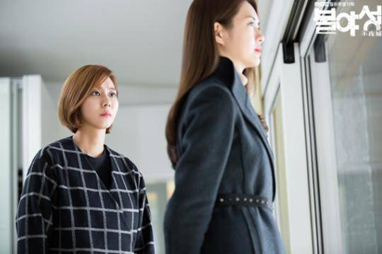 그런데 이 서이경의 무표정에 애틋함이 감도는 표정을 슬그머니 그려 넣는 유일한 인물이 한 사람 있다. 남자주인공이 아닌 해바라기처럼 서이경만을 바라보는 연약한 여성인물 이세진(유이)이다. <불야성>에서 서이경과 이세진의 관계는 단순한 자매애나 워맨스로 단정하기에는 조금 핀트가 어긋난 느낌이 있다. 그보다는 더 긴장과 설렘이 오가는 관계에 가깝다. 할리퀸에 등장하는 냉정하고 강한 남자와 그런 남자에게 끌리는 여주인공의 미묘한 사이를 떠올리면 쉽겠다(의외로 할리퀸을 BL로 바꿔도 그 느낌은 크게 달라지지 않을 것 같다). 그리고 누군가를 ‘덕질’해본 서태지 열혈팬 출신답게 이요원은 여배우이면서도 동성인 상대 여성인물을 탁월하게 조련시키는 매니악한 재능을 보여준다.