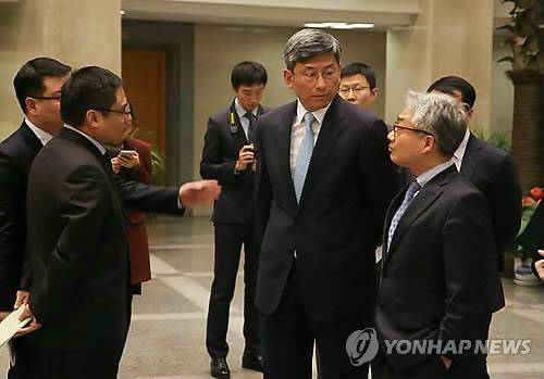 (베이징=연합뉴스) 더불어민주당의원 7명이 4일 베이징 외교부에서 왕이 외교부장을 만나는 자리에 천하이 아주국 부국장(앞줄 오른쪽 둘째)도 나타나 눈길을 끌었다. 천하이 부국장은 지난달 26일부터 30일까지 방한해 박지원 전 국민의당 원내대표를 비롯한 유력 정치인과 재계, 언론계 인사를 만난 것으로 전해져 논란이 일었다. 2017.1.5