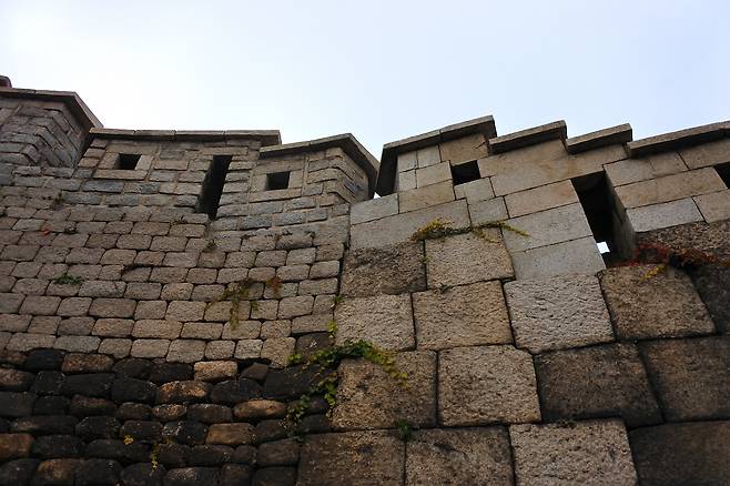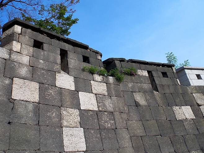 | ▲ 성돌 사진에서 오른쪽이 정조 이후의 양식이다. 사진 왼쪽 하단부 검은색을 띈 돌들은 세종 시기의 양식이다. 왼쪽 상단부와 오른쪽 여장은 근래에 다시 쌓은 것으로 보인다. |