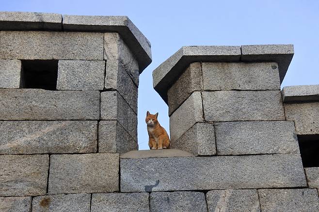 | ▲ 타 속의 고양이 '타'는 여장 하나의 단위를 말한다. 또한 여장과 여장 사이의 공간을 뜻하기도 한다. 타에서는 주로 활로 공격을 했다. 사진속 고양이가 앉아 있는 자리에서 활을 쏘았다는 것이다. |