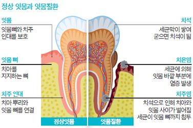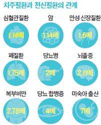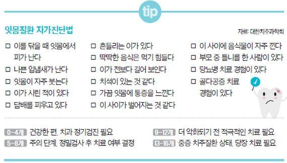 한국인을 대상으로 한 연구에서도 잇몸병과 전신질환의 연관성은 다시 한번 증명됐다. 국민건강보험공단 일산병원 치주과 김영택 교수가 2002~2013년 102만 명의 건강보험 데이터를 분석한 결과 잇몸병은 비만 위험을 10%, 고혈압·당뇨병 위험을 각각 7%·16% 높이는 것으로 나타났다. 류머티스성 관절염과 골다공증 위험은 17%·21% 높았고, 발기부전의 경우 53%나 높아지는 것으로 분석됐다.