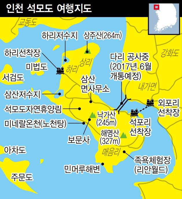 석모도, 인천 강화도에 딸린 11개의 유인도 가운데 하나다. 교동도에 이어 두 번째로 큰 섬, 수도권의 인기 여행 코스다. 배에 차를 싣고 들어가 당일치기로 섬 전체를 둘러보고 나올 수도 있다. 연 300만명에 이르는 강화군 관광객의 절반 가까이가 석모도를 경유한다. 갑판 위에서 몰려드는 갈매기떼에게 과자를 던져주며 사진을 찍고, 석모도의 민머루해변을 거닐다가 보문사를 둘러보고 나오는 이들이 대부분이다.