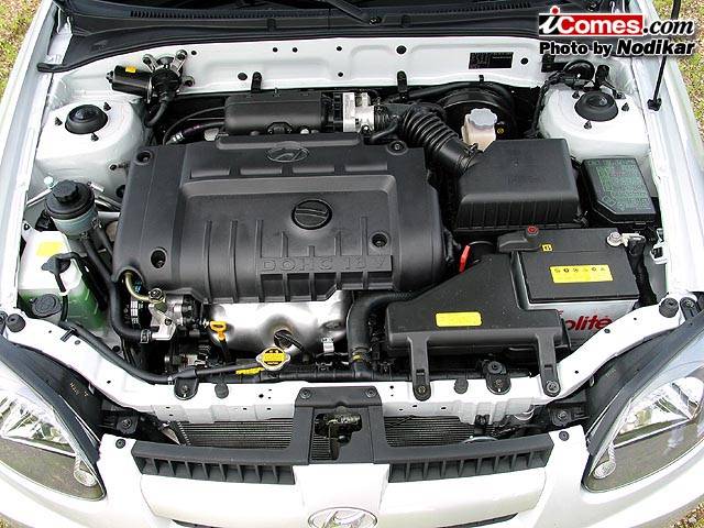 시승차는 1.5 DOHC16밸브로 한국시장에서 가장 많이 판매되는 사양으로 현대의 첫 번째 고유엔진인 알파 엔진. 우선은 엔진룸의 처리가 가장 인상적이다. 엔진블록에 커버가 씌워져 있고 배기 매니폴드를 전체적으로 감싼 마무리라든지 자주 손이 가는 부분이 눈에 들어오도록 설계해 정비성을 향상시키고 있다. 엔진과 트랜스미션을 받쳐주는 크로스 멤버도 가운데 하나밖에 없었던 것을 좌우 두 개 설계해 훨씬 안정감있는 구조로 하고 있다.