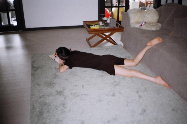 사진 속 설리는 편안한 블랙 원피스 차림으로 러그 위에 엎드려 종이에 무언가를 열심히 적고 있는 모습이다.
