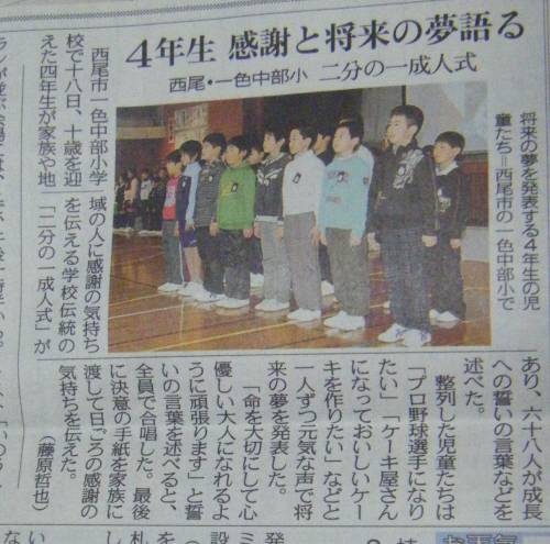 | 1/2 성인식. 부모는 10살이 된 아이들을 축하하며, 아이들은 부모에 대한 감사를 전한다. 지역과 학교에 따라 시기는 조금씩 다르지만 보통 어머니의 날, 아버지의 날이 있는 5월에 진행된다. |