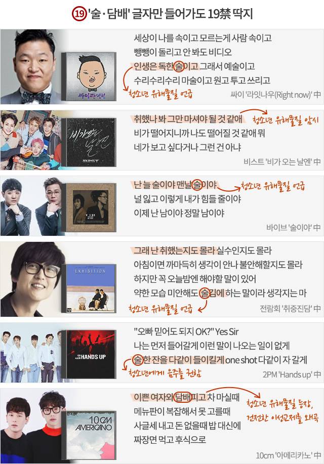 지난 2011년, 가요계에서는 1970년대 군사정권 시대에 비견하는 수난이 벌어졌다. 가요 심의의 칼을 쥔 여성가족부가 청소년들이 즐겨 듣는 가요 수십 곡에 무더기로 '19禁 딱지'를 붙인 것이다. 특히 몇몇 곡들은 노래 전체의 맥락은 무시한 채, 단지 '술·담배' 등의 단어가 들어갔다는 이유로 청소년유해매체물로 지정됐다. 발매된 지 꽤 시간이 흐른 바이브의 '술이야'(장혜진이 편곡), 전람회 '취중진담'(김조한이 편곡) 등도 이에 포함됐다. 싸이는 여가부의 조치에 대해 "황당하다, 이러니 인생은 독한 술(노래 가사 인용)이다"고 비꼬았고, SM·큐브 엔터테인먼트 등 대형 기획사들은 "헌법상 표현의 자유 침해"라며 여가부를 상대로 소송을 제기했다. 여가부 홈페이지는 성난 네티즌들의 항의 글로 한때 다운이 되기도 했다. 사태는 여가부의 음반심의위원장이 사퇴하고 심의 기준을 완화하겠다는 발표가 나온 후에야 일단락됐다. 그리고 이듬해인 2012년, '술이야', '라잇나우', '아메리카노' 등 대중을 납득시키지 못한 몇몇 금지곡이 유해매체물에서 해제됐다.