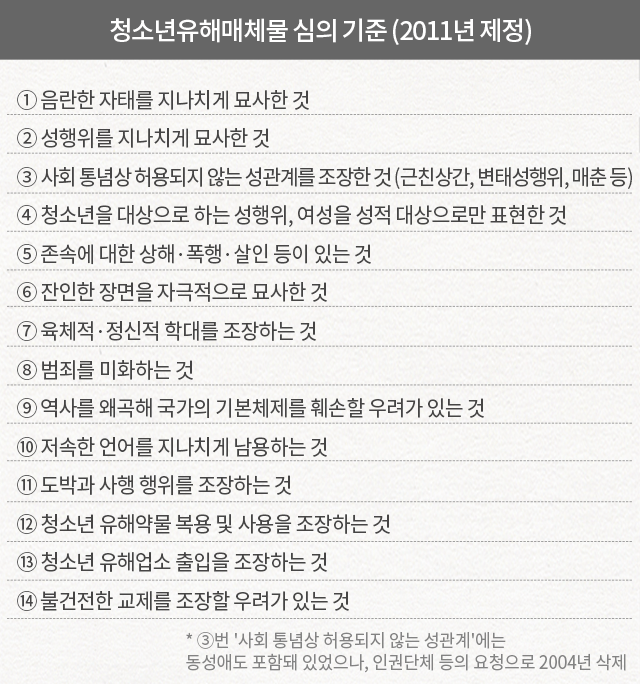 여성가족부 산하 '청소년보호위원회'가 심의·판정하는 매체로, 대상은 대중가요에만 한정되지 않으며 영화·공연·영상·방송·신문·잡지·광고·게임 등 광범위하다. 음반의 경우 '청소년 유해' 판정을 받으면 19세 미만 청소년에게 판매가 금지된다. 이 노래들은 음원 사이트에서도 '19금' 딱지가 붙은 채 공개되며, 성인 인증을 거쳐야 듣거나 가사를 볼 수 있다. 또한 방송에서도 오후 10시 이전에 해당 노래를 내보낼 수 없다. 이를 어길 경우 3년 이하의 징역 또는 2000만 원 이하의 벌금이 부과된다. 여성가족부는 매월 홈페이지에 청소년유해매체물을 고시하고 있다.