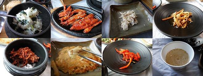 | ▲ 더덕정식 - 시계방향으로 더덕밥, 구이, 샐러드, 장아찌, 식혜, 무침, 튀김, 된장 |