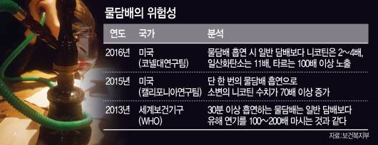 한국보건의료연구원 관계자는 “물담배 파이프를 여럿이 돌려쓸 경우 질병이 전염될 위험도 있다”며 “흡연 카페 등 새로운 흡연 문화가 우후죽순 생겨나는 만큼 적절한 규제를 마련해야 할 시점”이라고 말했다.