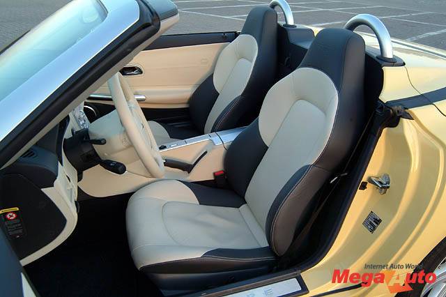 시트는 전형적인 2인승으로 보조 가방 등을 놓을 수 있는 공간도 없다. 운전석과 조수석 모두 전동식으로 6웨이, 4웨이 방식. 앉은 상태에서 윈드 실드 선단으로 인한 헤드레스트의 침입도 없다. 오른 팔을 뻗어 실렉트 레버를 잡는 감각은 약간 앞쪽으로 수그러지는 듯한 느낌.