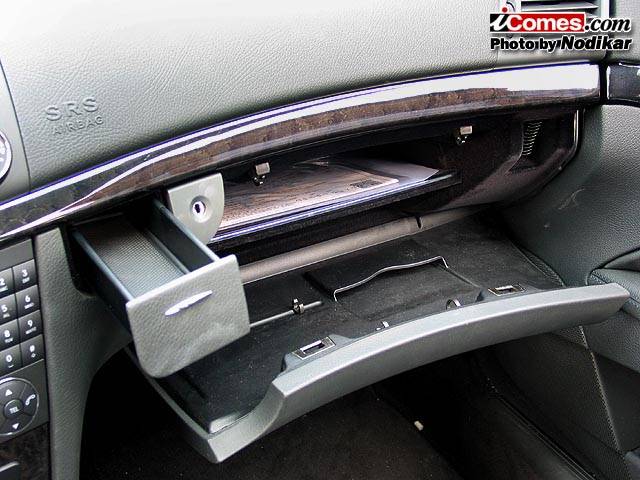 재미있는 것은 E클래스도 실내 곳곳에 수납공간을 가능한 많이 만들기 위한 흔적이 보인다는 것이다. 글로브박스를 2단으로 설계한 것과 운전석과 조수석 아래쪽에 수납함이 있는데 조수석쪽에는 응급처치함이 들어 있다. 센터콘솔박스 앞의 컵 홀더 등도 발상이 재미있다.