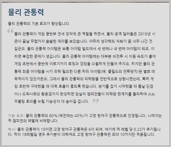 라이엇 게임즈는 암살자의 후속 패치로 챔피언 변경 뿐만 아니라 물리 관통력의 능력도 향상시켰다. 패치 이후 물리 관통력의 60%가 고정 방어구 관통력으로 인정되며 나머지는 적 챔피언 레벨에 비례한다.