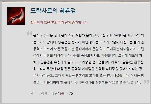 물리 관통력 능력치 변경에 따라 일부 아이템도 바뀌었다. 암살자 챔피언들이 즐겨쓰는 아이템은 '드락사르 황혼검'의 밤의 추적자 피해량이 50->75로 증가했다. 밤의 추적자는 1초 이상 눈에 띄지 않았을 경우 발휘된다.