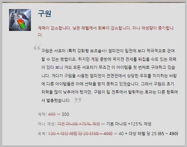 소규모 및 대규모 교전에서 위력을 발휘하며 서포터의 필수 아이템으로 자리잡은 '구원'이 소폭 하향됐다. 구원은 탱커류 챔피언들이 올리는 경우도 다수였는데 체력을 400->300으로 낮춰 구매를 억제했다. 한편 마나 재생력은 기본 마나의 +75% 재생->+125% 재생으로 높였다.