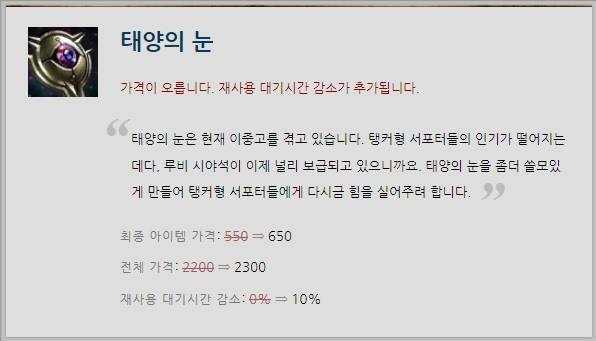 한편, 구원의 하향에 맞춰 일부 서포터 아이템이 상향됐다. '태양의 눈'은 최종 아이템 가격이 100 골드 증가했으나 재사용 대기 시간 10%라는 추가 효과가 부여됐다. 또한 '기사의 맹세'는 최종 가격이 100 골드 줄었다.